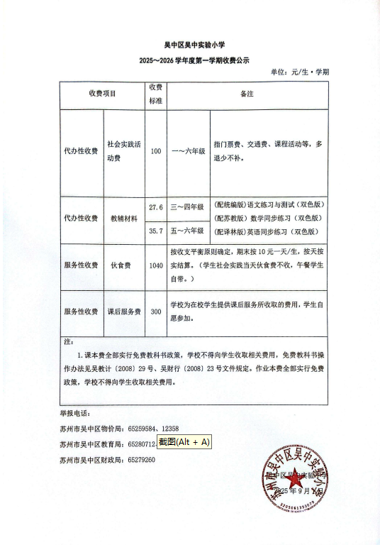 吴中区吴中实验小学2025-2026学年度第一学期收费公示
